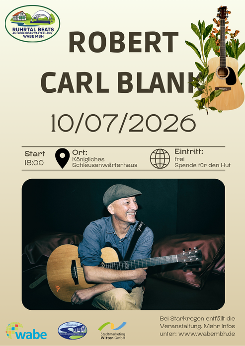 Am 10.07.2026 um 18:00 Uhr ist Robert Carl Blank zu Gast bei den Ruhrtal Beats. 🌅 Der Hamburger Musiker steht für ehrliche, handgemachte Musik zwischen Folk, Pop und Americana – mit einer Stimme, die berührt, und Texten, die Geschichten erzählen.